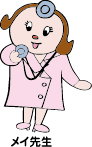 | 1) (メイメイメイメイメイ メイメイメイ先生) いつもやさしい メイ先生 今日はみんな お風邪ひいて苦しそう お咳コンコン 鼻ズーズー はやく治して メイ先生 お口はカバさん大きくね もしもし電話は静かにね ぽんぽんお腹は こちょこちょ うがいくちゅくちゅ 忘れずに ばいばいバイキンさようなら みんなにあげよう メイパワー いつもにこにこ メイ先生 みんな元気になったかな 泣かないよ 泣かないよ 痛くないよ 痛くないよ はしか 風疹 BCG 三混 おたふく みずぼうそう ポリオ 日脳 ふーるふる いっぱいチクチクチク 2)いつもすてきな メイ先生 今日はみんな ピンピンぴょんぴょん元気かな 注射チクチク 涙ぽろぽろ 痛くしないで メイ先生 ぶんぶん雷 おこりんぼう エンエン大雨 泣き虫 にっこり太陽 笑い顔 夢と希望の お友達 ハッピーハッピーハッピー 子どもたち がんばれ 元気のメイパワー |